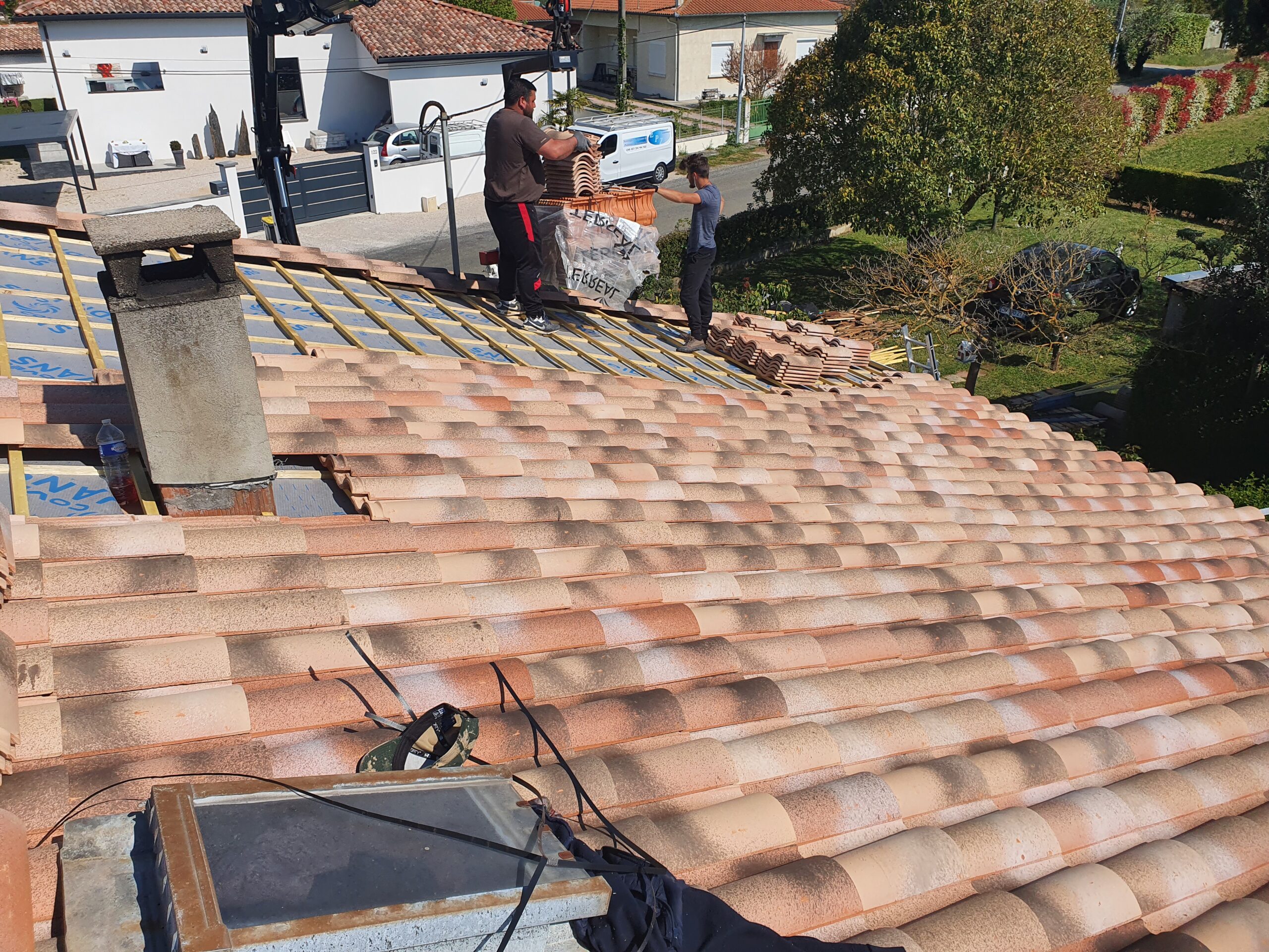 L’étape finale est la pose soignée des nouvelles tuiles, garantissant une couverture esthétique, solide et parfaitement étanche.